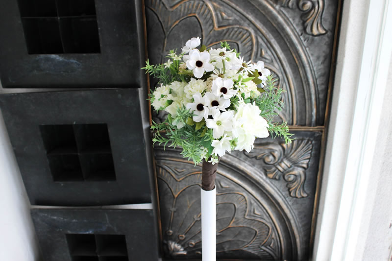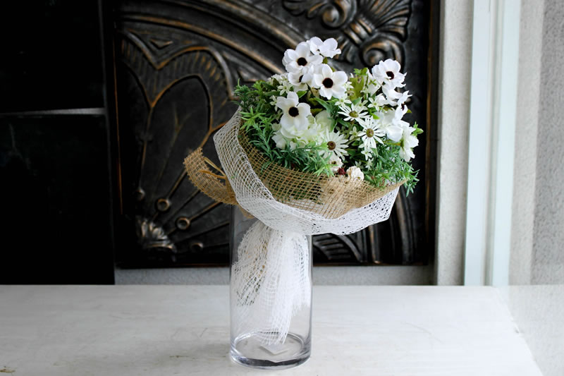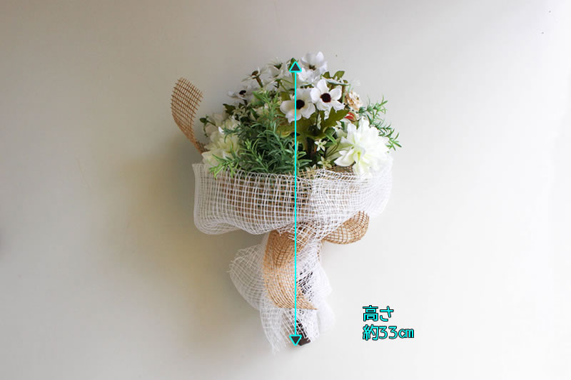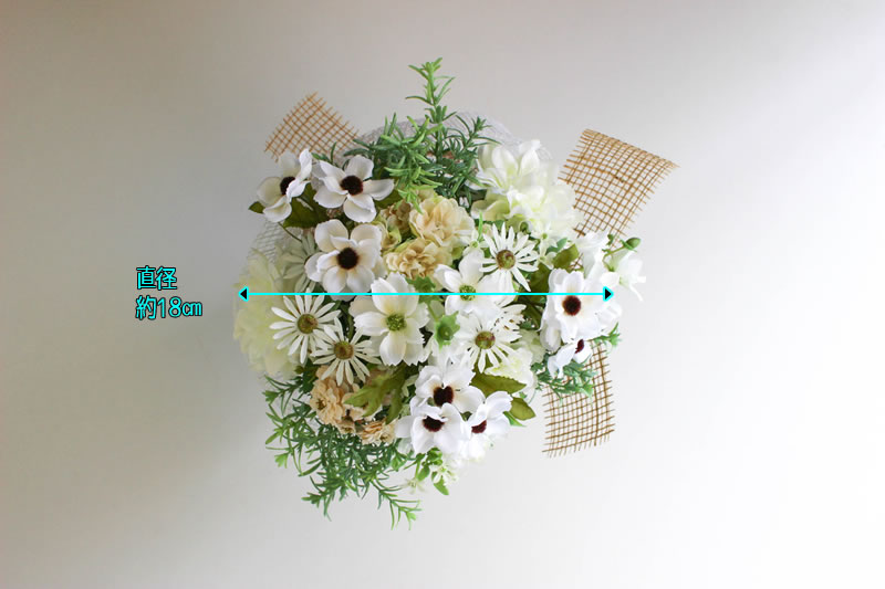 白い草花系の花やミニバラを集めた、アーティフィシャルフラワーの花束です。白とグリーンなので、お店でのディスプレイでは、展示商品のイメージを邪魔しない色だと思います。