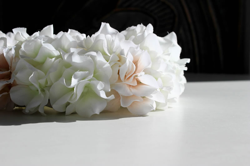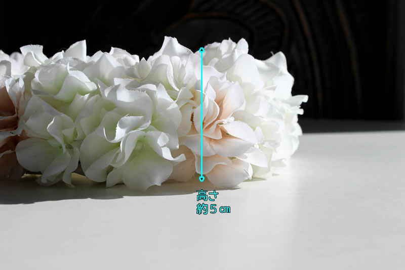アジサイの花びらは柔らかな布(ポリエステル)でできていて、ごわつきのない質感です。
